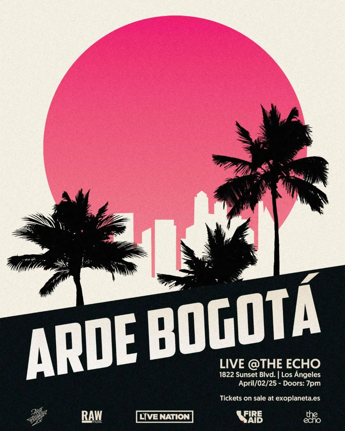 El próximo 2 de abril, la banda Cartagenera, España, ARDE BOGOTÁ se subirá al escenario de la legendaria sala THE ECHO y destinarán toda la recaudación del concierto a la organización FireAid para ayudar a los afectados por los incendios forestales en Los Ángeles.