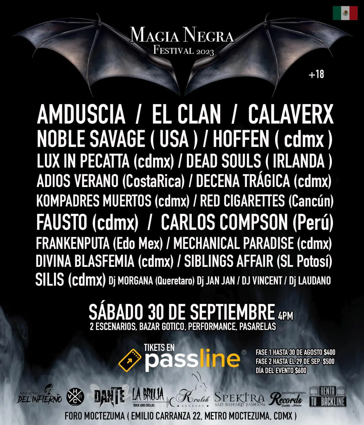 El evento que todos los amantes de la música oscura han estado esperando está a punto de regresar a la Ciudad de México. El Festival Magia Negra, conocido por ser “La Noche Más Oscura del Año”, está de vuelta con su esperada tercera edición que promete superar todas las expectativas. Esta tercera edición se llevará a cabo los días 30 de septiembre y 1 de octubre a partir de las cuatro de la tarde en el prestigioso Foro Moctezuma.