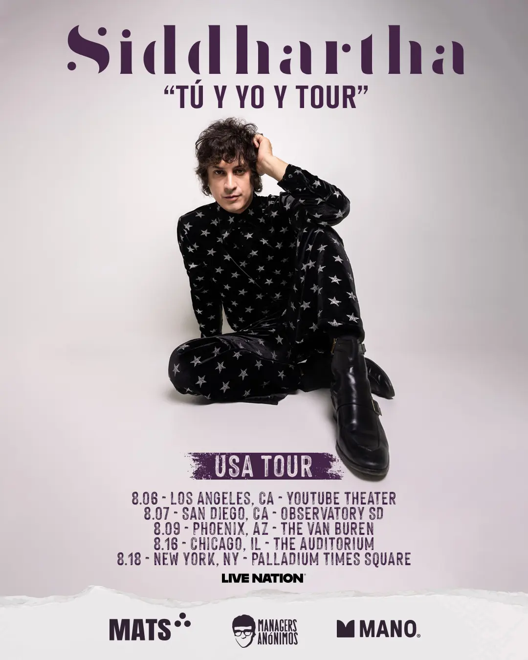 Como parte de este nuevo capítulo, Siddhartha anuncia su esperado regreso a los escenarios de Estados Unidos con el “Tú y Yo y Tour”, una gira producida por Live Nation que recorrerá cinco ciudades clave: