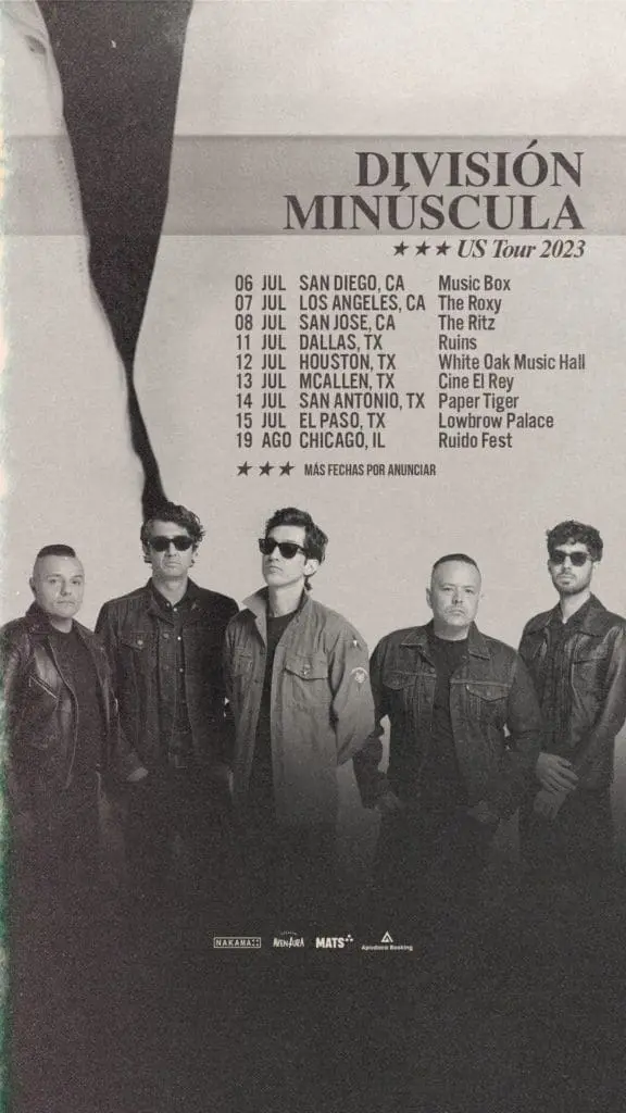 Los autores de icónicos éxitos como “Sismo”, “Sognare”, “Las Luces De Esta Ciudad”, “Humanos Como Tu”, y “Veneno Es Antídoto (S.O.S.)”, entre muchos otros, darán inicio en breve a la esperada gira que arrancará el 6 de julio en el Music Box de San Diego (California) y hará paradas en ciudades tan importantes como Los Ángeles, San José, Dallas, Houston y Chicago, entre otras. También incluirá una aparición en el festival anual de música latinoamericana Ruido Fest en Chicago el 19 de agosto. Los boletos se encuentran a la venta en https://linktr.ee/divisionminuscula