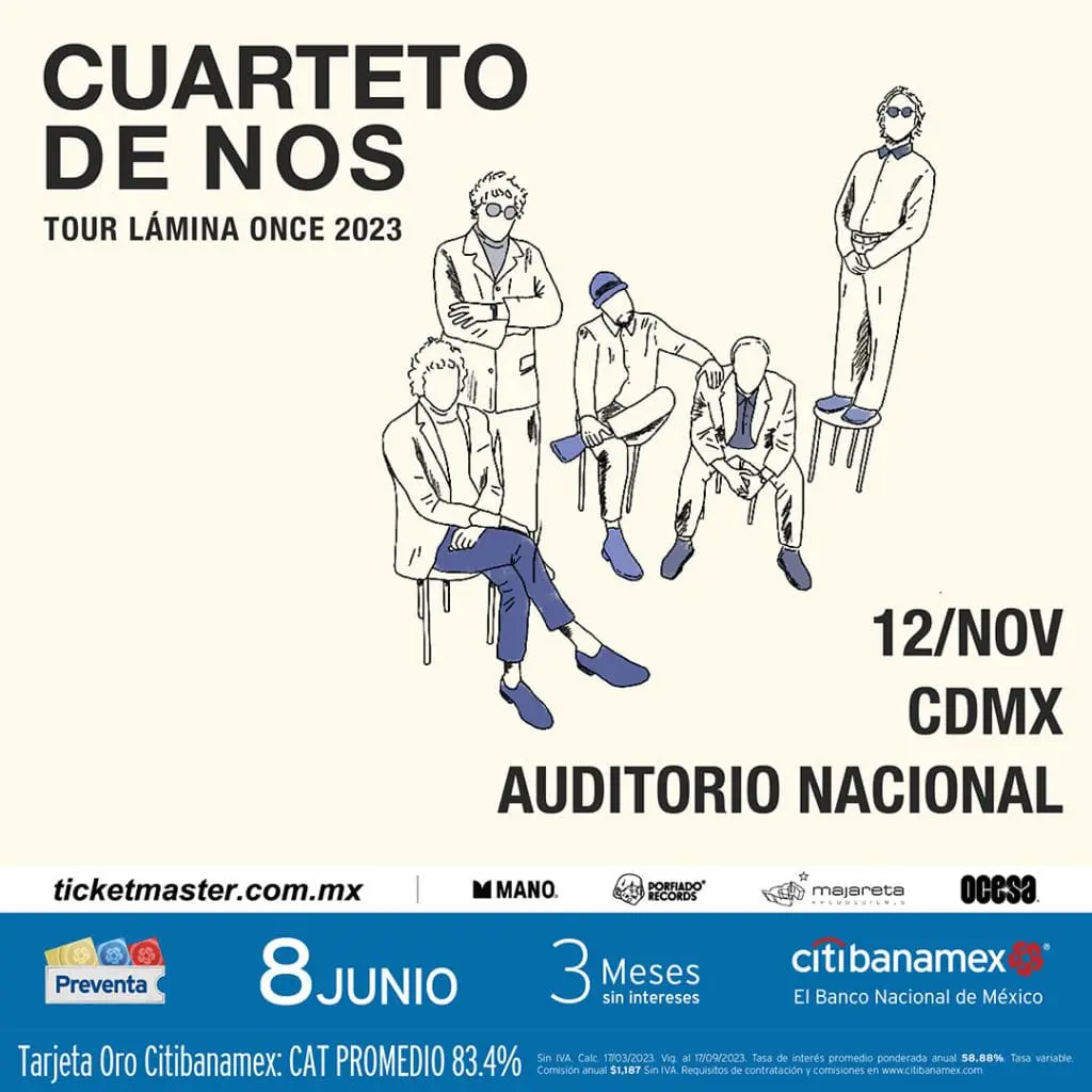 Cuarteto de Nos llega al Auditorio Nacional este 12 de noviembre. Los boletos estarán disponibles a partir del 8 de junio por Ticketmaster.