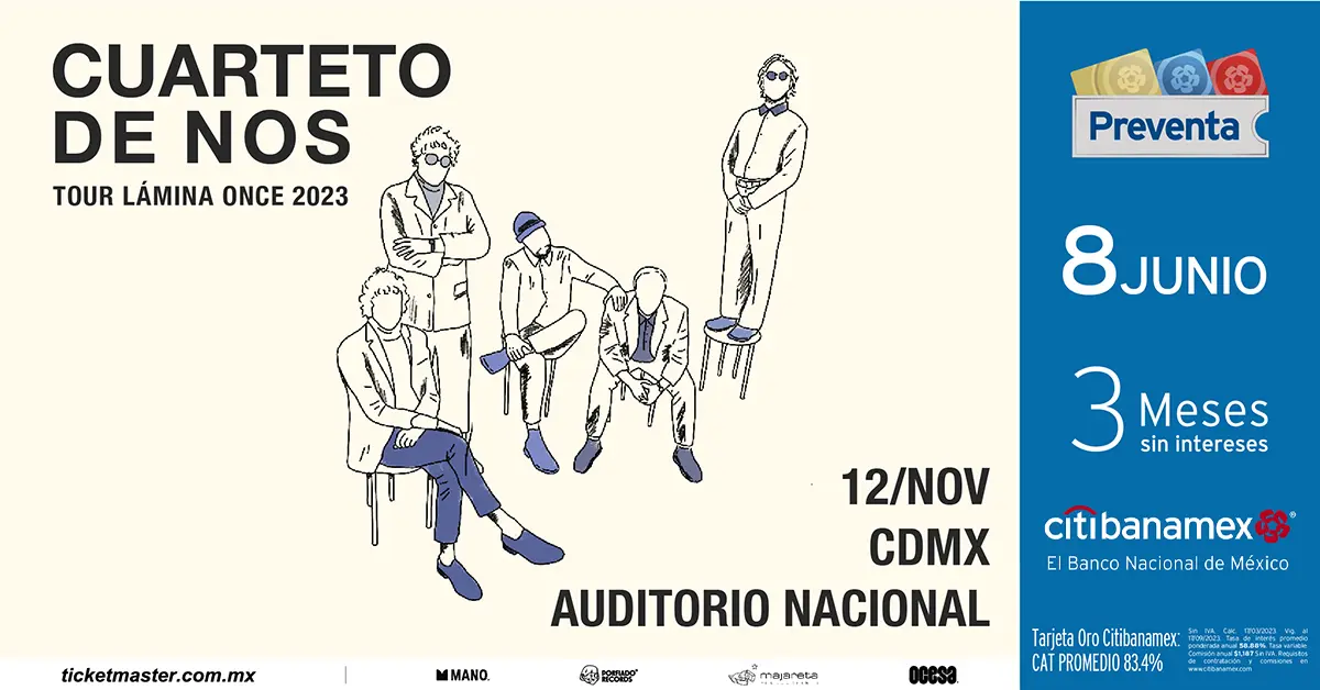 Cuarteto de Nos llega al Auditorio Nacional este 12 de noviembre. Los boletos estarán disponibles a partir del 8 de junio por Ticketmaster.