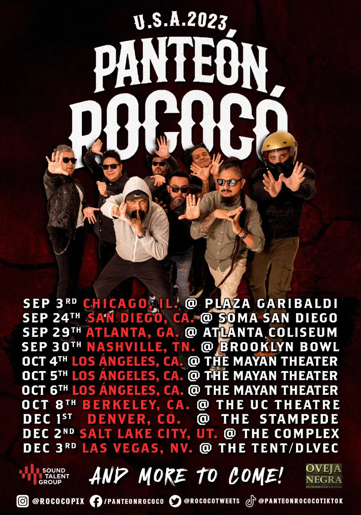 La gira de Panteón Rococó por EE.UU. incluirá tres importantes actuaciones en el Mayan Teather de Los Ángeles los días 4, 5 y 6 de octubre. A continuación, la banda regresará a México para una serie de paradas significativas, entre las que se incluyen dos actuaciones tituladas “Días de Panteón” en el Parque Bicentenario de la capital del país, con capacidad para 40.000 personas. Las entradas para la primera actuación de “Días de Panteón”, el 28 de octubre, se agotaron tan rápidamente que el grupo se vio obligado a añadir una segunda fecha debido a la demanda popular.